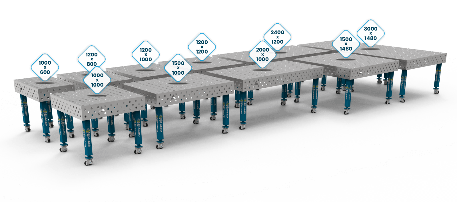 Nierdzewne stoły spawalnicze GPPH mają zarówno mniejsze, jak i większe rozmiary, aby sprostać różnym wymaganiom. Oferujemy stoły o wymiarach: 3000×1480 mm*, 2400×1200 mm, 2000×1000 mm, 1500×1480 mm, 1500×1000 mm, 1200×1200 mm, 1200×1000 mm, 1200×800 mm, 1000×1000 mm, 1000×600 mm.